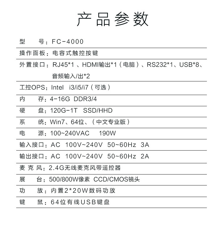 操作簡便——不但實現了基本電腦操作,並且集成了實物展台和無線麥克風等功能操作界麵一目了然,使用者無需培訓即可使用